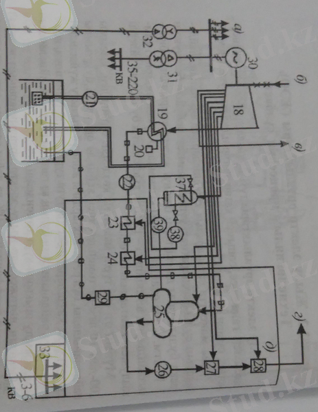 Сурет-2. Жылу энерго орталығының технологиялық процесінің принциптік сұлбасы. а) жергілікті тұтынушыларға берілетін электр энергиясы; б) қазаннан турбинаға жеткізілетін бу; в) өндіріске жіберілетін бу; г) экономайзер мен қазанға берілетін қоректендіру суы; д) деаэратор бөлімі.