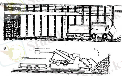 в-қондырмалы айырық-тақта; г-екі жақты қондырмалы айырық-тақта; д-жылжымалы платформа немесе вагон ауыстырғыш; е-аралық ыдыс және шығыршықты платформа; 1-тиегіш машина; 2-бос вагон; 3-тиелген вагон; 4-шығыр; 5-э лектровоз; 6-аралық ыдыс