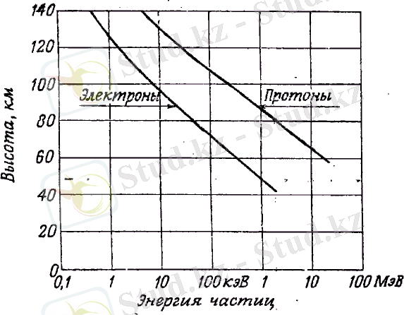 4 сурет. Бөлшектердің Жер атмосферасына вертикаль бағытпен кіргендегі ену тереңдіктері