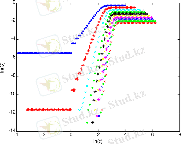 сияқты өзгереді деп күтуге болады. Басқаша айытқанда, d аттрактор өлшемі lnC(ε) белгілі ε диапозонындағы lnε тәуелділікгімен беріледі
