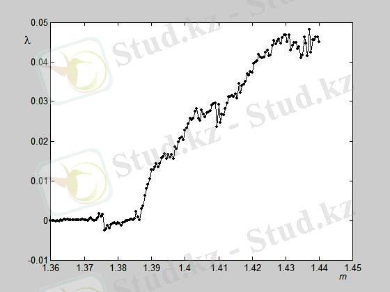 Мысал ретінде (3) логистикалық бейнеленуді қолданамыз. MatLab пакетінде r басқарушы параметрінен Ляпунов көрсеткішінің тәуелділік графигін саламыз (14-сурет) . Бұл программа төменде келтірілген. Ол үшін келесі m-файлдарды құрамыз: