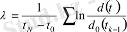13-сурет. Ляпунов көрсеткішінің ең үлкен мәнін анықтауда қолданылатын екі көрші траекторияның арасындағы ара қашықтықтың өзгерісі