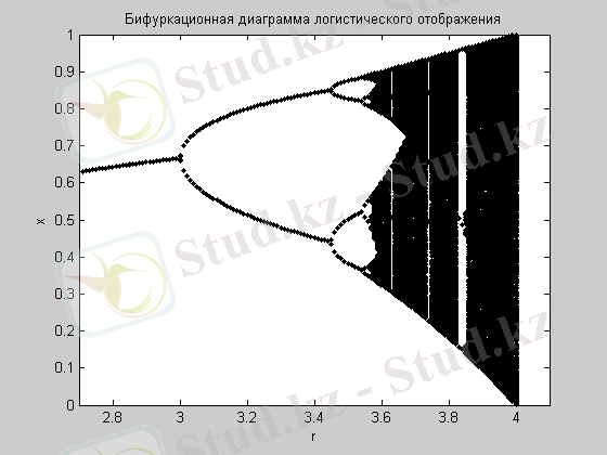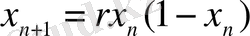 мұнда х n - физикалық өлшемнің байқалуы, r - басқарушы параметр. Төменде логикалық теңдеудің шешімін іске асыру, Пуанкаре программасы және сәйкес графиктер келтірілген (2, 3суреттер) . MatLab жүйесі арқылы алынған.