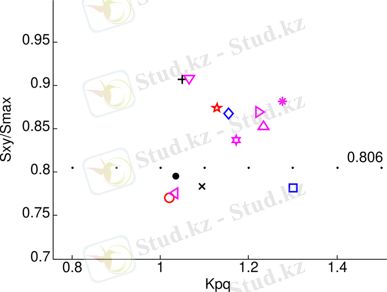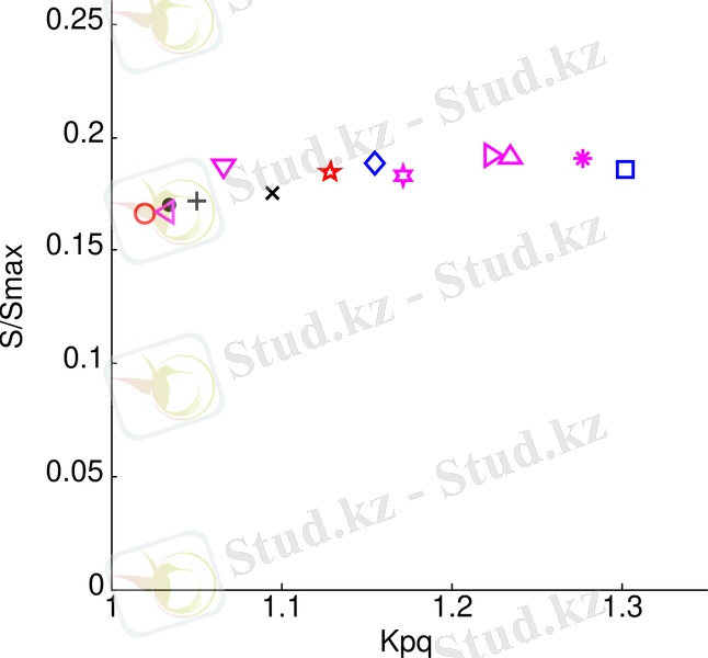 Айнымалы жұлдыздардың бифуркациялық диаграммасы сигналдың уақыт қатарының максималды мәні X max мен жалпыланған метрикалық сипаттаманың K pq тәуелділігі ретінде алынды, тәуелді параметрлердің өзгеруі кезінде екіге бөліну симметриясы көрінеді.