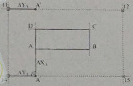 А нүктесіндегі (Сурет. 10) жобалау бөлімі оның координаттары және бойынша ең жақын тор нүктесінен есептелген мәндерден орындалады. 14-15 жолдың 14-тармағынан бастап, -нің дизайнын анықтаңыз және А' нүктесін белгілеңіз. Алынған нүктеде теодолит орнатылып, тордың жағынан бұрыш оң жаққа созылады. Онда проективтік шамасын перпендикулярға қойып, қажетті нүктені A орнатыңыз. 11-тармақтан перпендикулярдың дәлдігін арттыру үшін 11-12 сызық бойымен конструкциясының мәні белгіленеді және A’’ нүктесі бекітіледі. Бұдан басқа, A’нүктесінде A’’нүктесінде орнатылған құрылғыны қарап, құрылыс торына перпендикуляр алынады. А нүктесінің позициясының бақылауы оны құрылыс торының басқа нүктесінен алып тастау болып табылады. қалған B, C немесе D жобалау нүктелері табиғатқа сәйкес келеді, сәйкесінше 11, 12 немесе 15 тармақтардан.