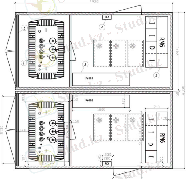 СКТрҚ типті трансформаторлы қосалқы сианцияны ғимараты екі бірдей модудьден тұрады. Әрбір модуль көлемі темір бетонды конструкция көрнісінде жерасты және жерүсті бөліктерге ие. Модульдік жерасты-цикольді бөлігі кабельді желілерді енгізуге және қосылғыш кабельді ұсташқышты төсеуге арналған монолистті темір бетон тақтасынан жасалған ірге тасқа орнатылатын көлемді темір бетонды жертөлені білдіреді. Әрі қарай аталған модуль бөлігі қысқаша «көлемді ойыққ» (КО) деп аталады.