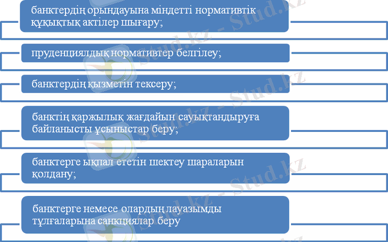 - банкiлерге санкциялар салу арқылы реттеудi жүзеге асырады.