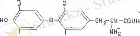 X и м и я л ы қ т а б и ғ а т ы. Қалқанша бездің негізгі де әсі-ресе активті гормоны тироксин мен трнйодтиронин. Ол гормон-дар бірнеше рет айналып езгеру нәтижесінде тирозин амин қыш-қылынан түзіледі. Йодидтер ерекше пероксидаза ферментінін әсер етуімен тиреоглобулин белогы құрамындағы тирозин қалдығымен реакцияласады. Мұнда тирозиннің бүйірлік тобы йодтанады және монойодтирозиндер мен дийодтирозиндер түзіледі. Тиреоглобулин гидролизі кезінде тирозинйің йодтанған туындылары және басқа да амин қышқылдары босайды. Тироксин дийодтирозиннің екі молекуласының'тотыға конденсациялану жолымен түзіледі, бұл кезде аланин бәлініп шығады. Ал монойодтирозин мен дийодтирозиннен трийодтиронин түзіледі.