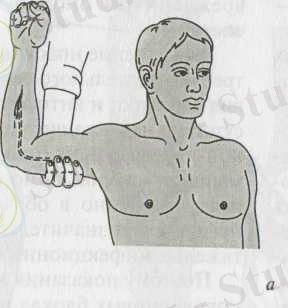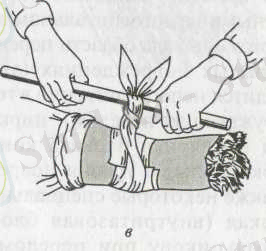 Сур. 1. Қан кетуді уақытша тоқтатудың әдістері: а - артерияны саусақпен басу ; б - максимальды аяқ-қолды бүгу; в - жгута-бұрау салу; г - басып таңу салу ; д - жарадағы тамырға зажим салу .