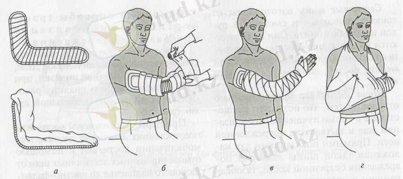 а - дайындық; б - шинаны салу; в - қол шинада; г - орамалдық таңғышпен бекітілген