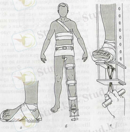 а - өкшені фиксациялау; б -шинаны фиксациялау; в - бұрауды қолдану арқылы тарту жасау; г - иммобилизацияның нәтижесі