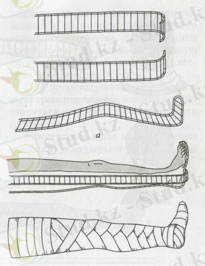 Рис. 7. Балтыр сүйектері сынықтарында сатылы шинамен иммобилизациялау: