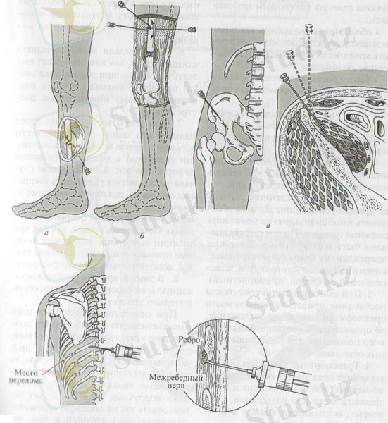а - сынық аймағы; б -циркулярлы; в -Школьников бойынша жамбас ішілік; г -қабырғааралық жүйкелерді; д - вaгосимпатикалық