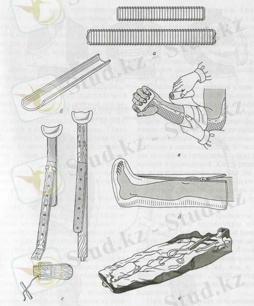а - сатылы (Крамер) ; б - лубковая; в - торлы; г - Дитерихс; д - надувная (пневматическая) ; е - вакуумды носилкалар