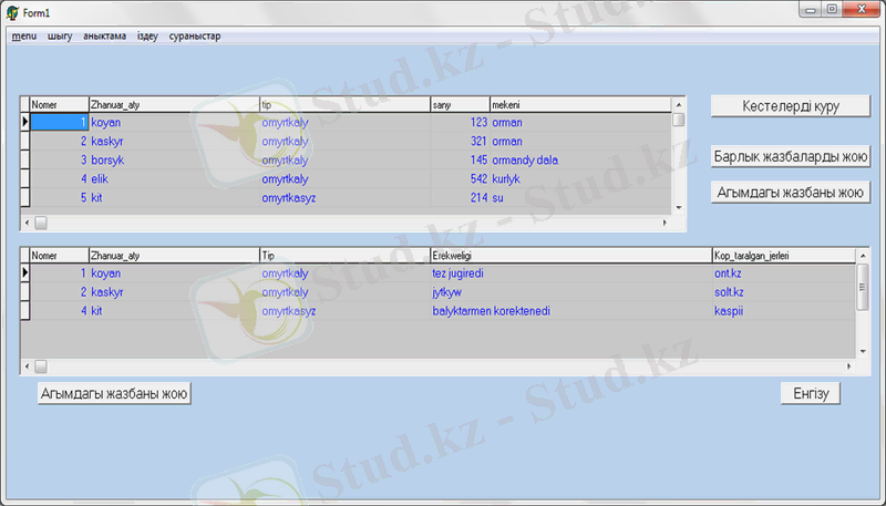 Оң жақ бұрыштағы «Жануарлар әлемі» батырмасын басқан кезде кестелерге жануарлар туралы мәлімет енгізілген формаға өтеміз.