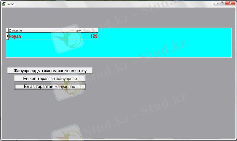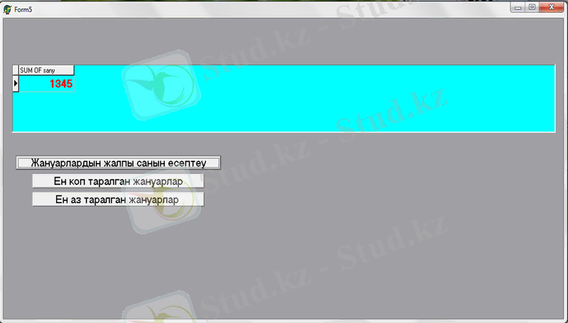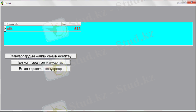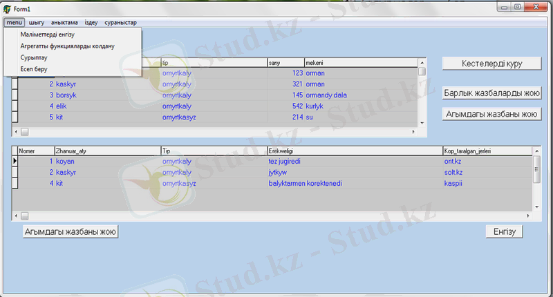 Сонымен қатар бұл мәліметтер қорында агрегаттық функцияларды қолдана отырып амалдар орындауға болады. Ол үшін Menu-де «Агрегаттық функцияларды қолдану» пунктін таңдаймыз. Келесі формада «Жануарлардың жалпы санын есептеу», «Ең коп таралған жануарлар» және «Ең аз таралған жануарлар» деген батырмалар бар.