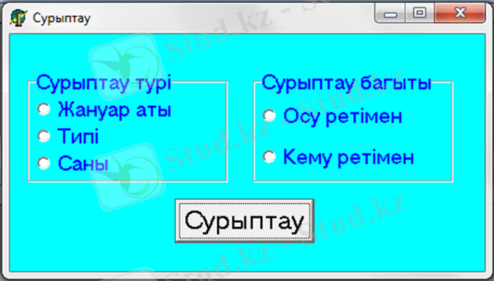 «Жануарлар әлемі» мәліметтер қорында сұрыптау жүргізуді келесідей орындаймыз: «Сұрыптау түрі» және «Сұрыптау бағыты».