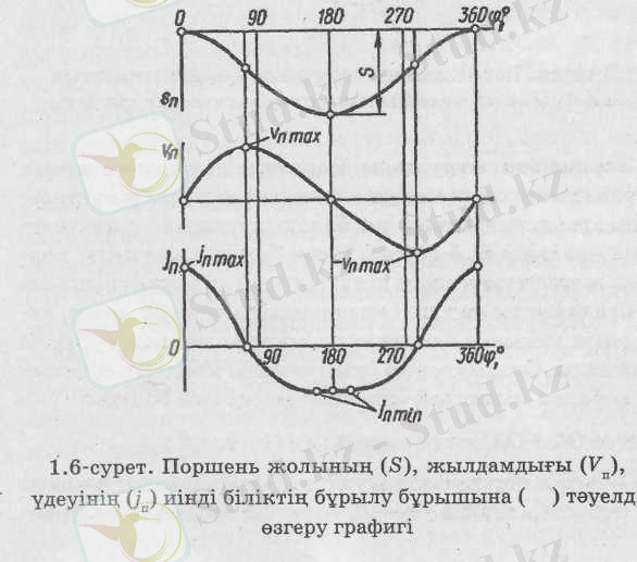 Осы формуламен есептелген поршень жылдамдығының графигі де сол 1. 6-суретте көрсетілген. Сол графикке жүгінсек, оның жылдамдығы поршеньнің шекті нүктелерінде нөлге тең болатынын көреміз. Ал ең жоғарғы жылдамдық жүріс жолының ортасынан ауытқып кетеді екен. Оның -қатынасымен түсіндіруге болады.