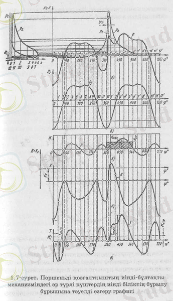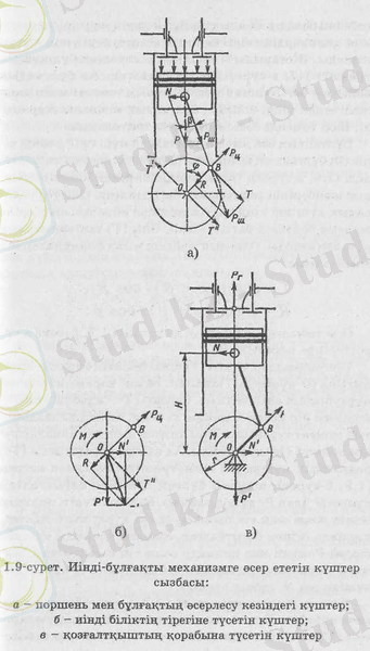 себепші болады. Сондықтан бұл күштің мәндері поршень мен цилиндрдің тиісті беріктік есептеулері үшін қолданылады. Жоғарыдағы тәсілмен есептелген бұл күштің графигі 3, в-суретінде көрсетілген. Ал бұлғақтың бойымен бағытталған күш оның төменгі мойнымен жалғасқан айнымалы біліктің бұлғақтық мойнына әсер етеді. Енді төменде соны анықтауға тоқталамыз.