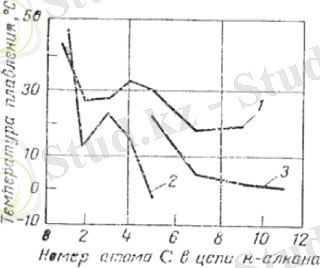 Сурет 1 - Орынбасардың орналасуынан және құрылымынан моноорынбасарлы н-алканның балқу температурасынын тәуелділігі