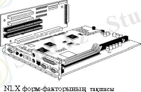NLX. 1997 жылы Intel корпорациясы компьютерге арнап жаңа стандарт ойлап тапты. Оның жақсысы жүйелік блоктан тақшаға енетін кабелі жоқ. Ол үшін Riser- тақшасының слоты PCI және ISA болуы керек, сонымен қатар көлемі аналық тақшадан NLX Riser Connector болғаны дұрыс. Сондықтан да, аналық тақшаны орнатқаннан кейін ол дереу жүйеге және шинаға қосылады. Системада барлығы екі көлем PCI және ISA болады. Ризер- картада контроллер көлемдері IDE, FDD орналасқан, сонымен қатар желілі картаға енетін орнын да қарастырған, CD-Audio және USB шинасы. Maineboard аналық тақшасында CPU- ға арналған шеге, жад слоттары, чипсет, BIOS және кэш болады.