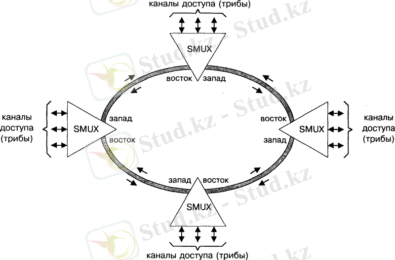 SMUX синхронды мультиплексорларда оптикалық агрегатты шығыстардың (қабылдап/ таратушы арналардың) : шығыс - батыс екі жұптың бар болуының арқасында кездесуші ағындары бар екі сақинаны түзуге мүмкіндік береді.
