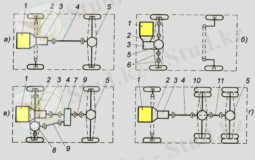 1-двигатель; 2-ілінісу муфтасы, 3-берліс қорабы, 4-карданды білік, 5-артқы белдеме, 6-басты беріліс, 7-дефферинциал, 8-жартылай ось