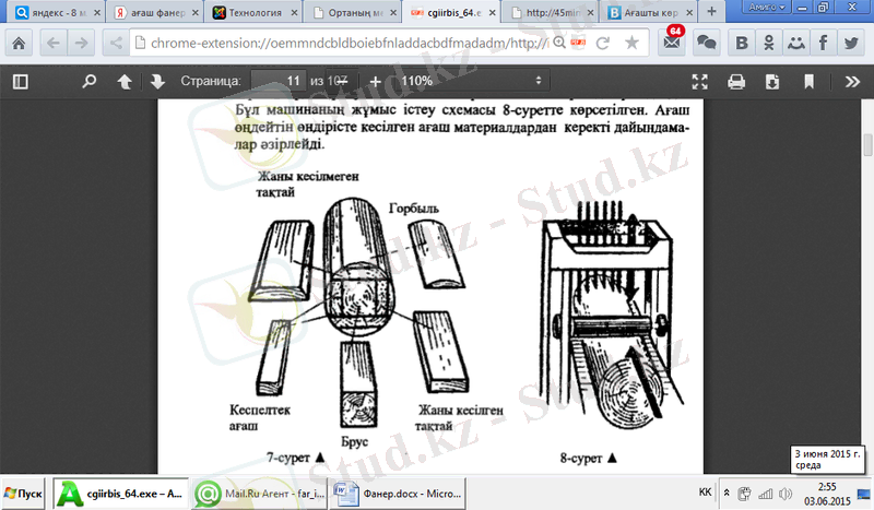 Теориялық мағлұматтар: Ормандағы ағаш кесетін ұсталар ағаш дайындау кезінде оларды арнаулы механикалық ара кѳмегімен кеседі. Бұтақ кесетін машинаның операторлары ағаштың бұтақтарын кесіп оларды келесі ѳңдеуге жібереді. Ағаштың бағанасын қабығынан тазартып ѳлшемін келесі ѳңдеуғе ыңғайлап бѳренеге айналдырады. Бѳренені бойлық бағытта тілгенде кесілген ағаш материалы екі жағы кесілген және кесілмеген тақтай горбыль кеспелтек ағаш және брус пайда болады (7-сурет) . Бұл жұмыстарды арнаулы ағаш кесетін рама машиналарында орындайды. Бұл машинаның жүмыс істеу схемасы 8-суретте кѳрсетілген. Ағаш ѳңдейтін ѳндірісте кесілген ағаш материалдардан керекті дайьшдама- лар әзірлейді.