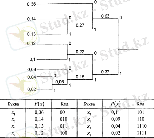 Хаффмен әдісі бойынша әріптер баған бойына жоғарыдан төмен қарай жазылады. Ол Р (х і ) ықтималдығы бойынша кему ретімен орналасып, кодтық ағаш сұлбасын түзеді (1-сурет) .