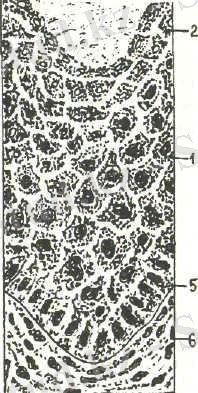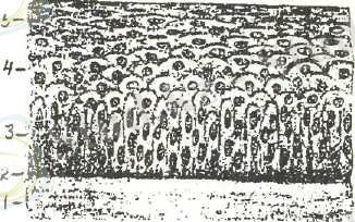 1-дәнекер ұлпа, 2 базальдық мембрана, 3 -базальдық Кабаттың эпителиалдық клеткалары, 4 - көп бұрышты клет-калар кабаты, 5 - жалпақ клеткалардын беткі қабаты.