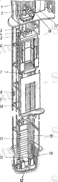 1 - машина бөлмесі; 2 - көтергіш механизмі (жүкарба) ; 3 -тасымалдаушы арқан; 4 - аспа; 5 - ұстап қалғыштар; 6 - кабина; 7 - тосп; 8 - шахта; 9 - бағыттаушы кабиналар; 10 - бағыттаушы қарсы-салмақ; 11 - қарсы-салмақ; 12 - буфері; 13 - түпкі бөлме; 14 -созып кигізілген қондырғының шектеулі жылдамдығы; 15 -арқанның шектеулі жылдамдығы; 16 -шекті жылдамдық; 17 - лифтті басқару панелі.