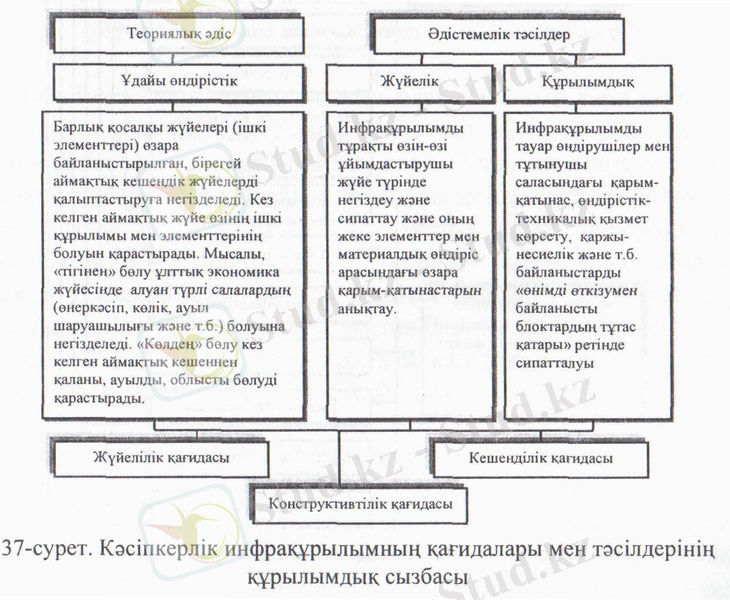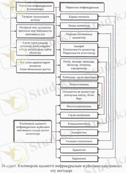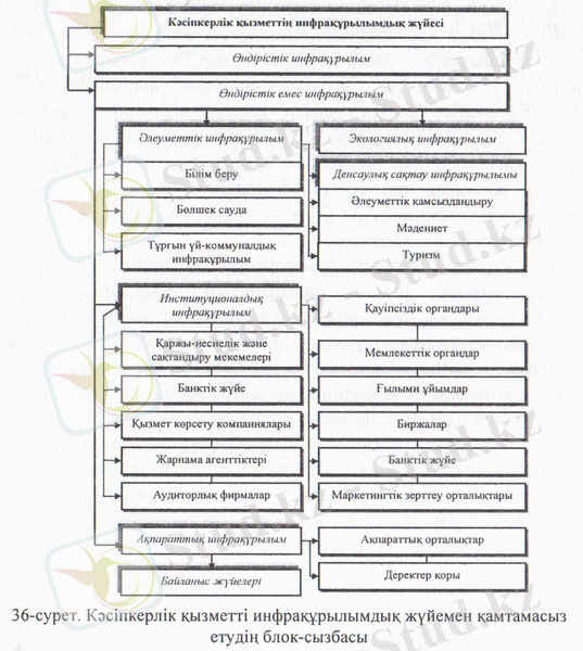 Кәсіпкерлік инфрақұрылымды зерделеу оның инфрақұрылымын қамтамасыз етуде ұлттық және аймақтық ерекшеліктерді ескеріп, қажетті іс-шараларды жүргізуге, құрал-жабдықтарды жасап шығаруға мүмкіндік береді. Өз кезегінде ол аймақтың, қаланың, ауданның, элеуметтік-экономикалық даму-ына үлкен әсер етеді (38-сурет) .
