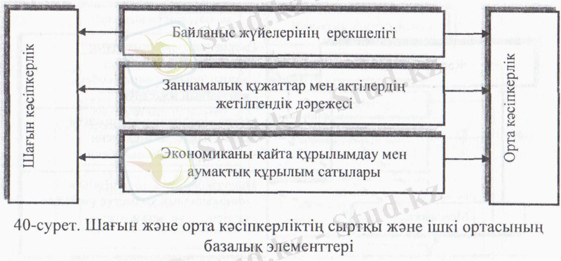 Осы тұрғыдан алғанда, шағын және орта кәсіпкерліктің қалыптасуына әсер ететін жүйелік құраушы факторлар оның қызметінің сыртқы және ішкі ортасының жиынтығымен анықталады (40-сурет) .