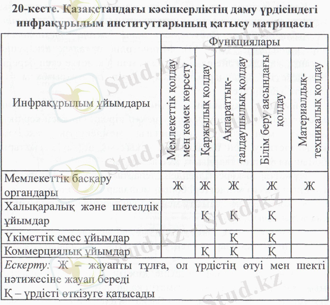 ¥йымдық және функционалдық құрылымдарды сәйкестендіру Қазақстандағы кәсіпкерліктің даму үрдісіндегі институттардың оған қатысу деңгейінің матрицасын құрастыруға мүмкіндік береді (20-кесте) .