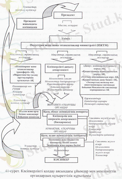 Кәсіпкерліктің дамуы үшін жауапты және саясатты жүзеге асыратын жоғары мемлекеттік орган - Қазақстан Республикасының Ипдустрия және жаңа технологиялар министрлігі (ИЖТМ) . Министрлік орталық атқарушы органға жатады және ел Президенті мен Үкіметке есеп береді. Мемлекеттік органдардың құзыреттерін тарату сызбасы 41-суретте келтірілген.