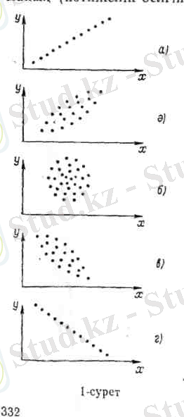 Біз талдауымызды жұптық корреляциядан бастайық. Корреляциялық анализ жасау корреляциялық таблица мәліметтеріне сүйенеді. Сонымен қатар бастапқы информацияны бір жүйеге келтірудің екінші жолы графиктік тәсіл. Графикалық тәсілдің мақсаты - корреляциялық өріс құру. Мұның үшін тікбұрышты координаттар жүйесінің абсциссалар өсіне факториалды белгілі мәндерін, ал ординаталар өсіне нәтижелік белгі мәндерін салып координаттар жазықтығындағы нүктелер жиынын анықтаймыз. Бұл жиындар түрлі формадағы өрістерді көрсетеді. Мұның кейбір түрлері 1-суретте келтірілген: а-суретте x пен y арасындағы тәуелділігі 1, ә-суретте x пен y тәуелділігі әлсіз тура түзу сызықты (r=+0. 5) болуын көрсетеді: 1, б- суретте x пен y-тің тәуелділігі түзу сызықты (r=0. 000) болуын көрсетеді: 1, в-суретте x пен y тәуелділігі әлсіз кері түзу сызықты (r=-0. 5) болуы көрсетіледі; 1, г-суретте x пен y тәуелділігі қатаң кері түзу сызықты (r=-1. 00) болуын көрсетеді. Мұндағы айнымалылар арасындағы тәуелділік тығыздығын көрсететін шама - бұл корреляциялық коэффициент.
