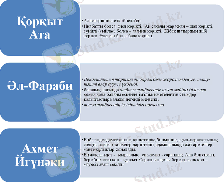Ұрпақтың әдептілігі мен тәрбиесі жөніндегі ұлы ғұламалардың идеяларын саралай келіп, қысқаша тұжырымдамасын (сурет 1) көруге болады.