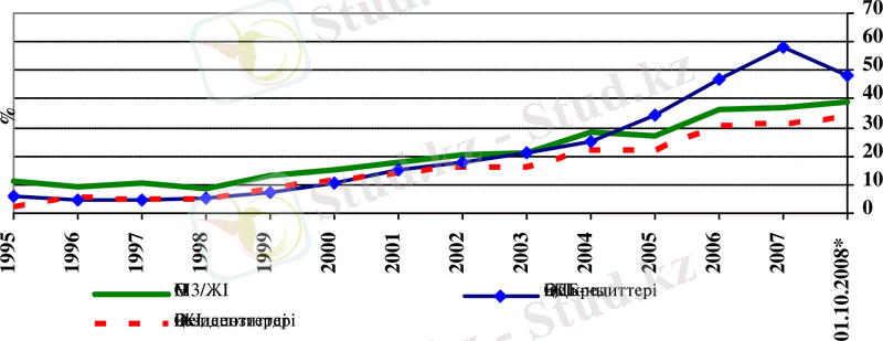2007 жылмен салыстырғанда 2008 жылдың 10-айында екінші деңгейлі банктердің несиелерінің (ЕДБ) жалпы ішкі өнімге (ЖІӨ) шаққандағы қатынасы 10%-ға дейін төмендеді.