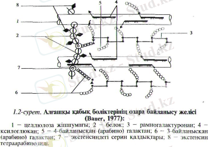 Клетка қабығынын құрылысы . Жалпы құрамының күрделілігіне карамастан қабықтың қалындығы 0, 1 ден ондаған микрон аралығында болады. Меристеманың бөлінетін және созылып өсетін клеткаларын қоршаған алғашкы қабық біртіндеп қалындап, қайталама қабыққа айналады. Көрші екі клетканың алғашқы қабықтарының арасында табақша (пластинка) деп аталатын аморфты үшінші қабықша пайда болады. Жалпы клетка қабығының құрамына енетін бөліктердің өзара байланысу жолдары 1. 2-суретте бейнеленген. Онда, ең алдымен целлюлоза молекулалары өзара сутекті байланыспеп жалғасып жіңішке жіпшумақтарга бірігеді. Оларға гемицеллюлозалар да сутек арқылы байланысады. Клетка қабығындағы пектин, гемицеллюлоза және экстенсин (белок) молекулалары өзара ковалентгік байланыс арқылы тұтасады. Пектинді полисахарид - ксилоглюканның бір тізбегі целлюлозаның бірнеше тізбегімен байланысса, пеллюлозаның бір тізбегі ксилоглюкан арқылы бірнеше пектинді полимерлермен байланысады. Сөйтіп қабықтығ құрылысында өзара айқасқан ковалентгік байланыстар жүйесі пайда болады.