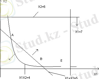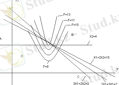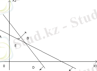 Есепті геометриялық тәсілмен шығарайық. Координаттар өсінде есептің шешімі мүмкін бола алатын аймақ. АВ кесіндісімен шектелген. Днңгей сызығы шеңбер арқылы бейнелейді. Шеңбердің бас нүктесінің (Е) координаттарын табу үшін мақсат функциясының өрнегін нөлге теңестіреміз.