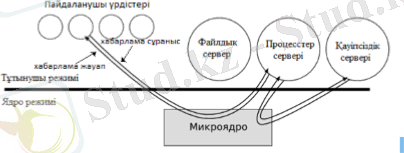 Артықшылығы жоғары режимде жұмыс істейтін және аппаратураны басқару бойынша тек минимум функцияларды атқаратын микроядро негізінде операциялық жүйе құру альтернативті болып табылады. Бұл жағдайда операциялық жүйенің неғұрлым жоғары деңгейлі функциялары арнайыландырылған компоненттер - пайдаланушы режимінде жұмыс істейтін серверлер арқылы орындалады. Осы кезде деректерді басқару мен алмасу хабарламаларды жеткізу негізгі функцияларының бірі болып табылатын хабарламаларды тарату арқылы жүзеге асырылады (7-сурет)