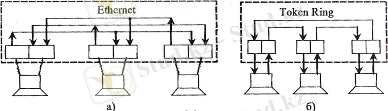 Token Ring шоғырлауышы келіп түскен кіріс сигналдарын тек сақинадағы келесі компьютер жалғанған бір-ақ портына ғана жібереді (1. 2б-сурет) .