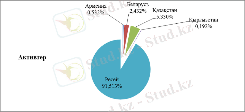ЕЭО-ға мүше елдер ішінде банктерінің активтер көлемі бойынша талдайтын болсақ, диаграммада көріп отырғанымыздай банк активтерінің көп үлесін Ресей 91, 5%-бен иемденіп отыр. Одан кейінгі орында Қазақстан 5, 3%-ын, Беларусь 2, 4%-ын алып отыр.