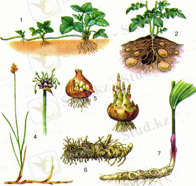 1) мүк және плаун сияқты өсімдіктердің жер астындағы ересек бөлімдері қурап қалып, олардан өсіп шықкан «өркендері» әрмен карай өсіп көбейеді;