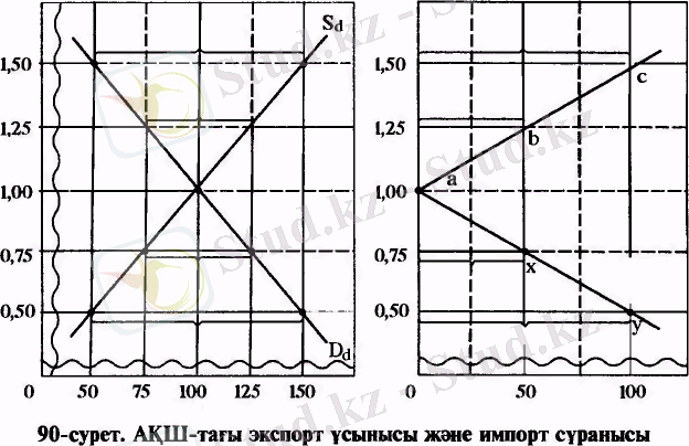 АҚШ-тағы экспорт сұранысы 90(а) -суреттегідей 1 долл. кем болса АҚШ импорты өседі. Мысалы, 0, 75 долл. ұсыныс қисығы бойынша америкалық фирмалар мемлекет ішінде 75 млн. фунт алюминийді пайдалы сата алады. Ал сұраныс қисығы бойынша америкалықтар осы бағамен 125 млн. фунт алюминийді сатып алғысы келеді. Сондықтан АҚШ тұтынушыларын қамту үшін 50 млн. фунт алюминийді импорттайды. Дүниежүзілік баға 0, 50 долл. болса, америкалық өндірушілер 50 млн. фунт алюминий өндіреді. Ал америкалықтарға 150 млн. фунт жетпейтіндіктен олар оны импорттайды. 90(ә) -суретте сұраныс қисығы көрсетілген. Төмен бағытталған қисықпен дүниежүзілік баға 1 долл. төмен болғандағы алюминий импорт көлемі көрсетілген, дүниежүзілік баға мен импорт арасыңда кері қатынас бар. Егер баға 1 долл. болса, онда импорт көлемі /а нүктесі/ О-ге тең, баға 0, 75 долл. болса, онда олар 50 млн. ф. импорттайды /х/; 0, 50 долл. болса, онда олар 100 млн. ф. импорттайды /у/, а, х, у нүктелерінің қиылысуы нәтижесінде төмен бағытталған америкалық импорт сұранысы қалыптасады. Дүниежүзілік баға ішкі бағамен салыстырғанда өссе, онда Американың экспорты да өседі.