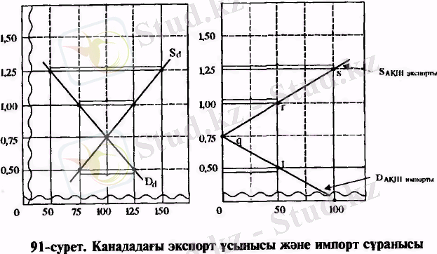 Канададағы ұсыныс пен сұраныс. 91-суретте Канадаға талдау жасайық. (Канада долларын бағам бойынша АҚШ долларына ауыстырдық. ) Канададағы алюминий бағасы - 0, 75 долл. Егер дүниежүзілік баға 0, 75 долл. болса, Канада импорттамайды және экспорттамайды. (91(ә) -сурет, у нүктесі) . Егер баға 0, 75 долл. жоғары болса, онда Канада фирмалары тұтынушылар сұраныс мүмкіншілігінен көп шығарып, қалдығын экспорттайды. Егер дүниежүзілік баға 1 долл. болса, онда Канада 50 млн. фунт алюминийді экспорттайды (б нүктесі) . Баға 1, 25 долл. болса, 100 млн. фунт алюминийді экспорттайды (8 нүктесі) . Жоғары жылжыған Канаданың экспорт ұсыныс қисығы 0, 7 долл. жоғары болса, алюминийдің экспорт көлемін көрсетеді, дүниежүзілік баға 0, 75 долл. төмен болса, онда Канада тұтынушылар сұранысын толық қанағаттандыра алмайды, 0, 50 долл. болса, онда тұтынушылар 125 млн. фунт алюминий сатып ала алады, ал Канада фирмалары тек 75 млн. фунт алюминийді өндіре алады. Сондықтан олар тұтынушылар сұранысын қанағаттандыру үшін 50 млн. фунт алюминийді импорттайды (t) .