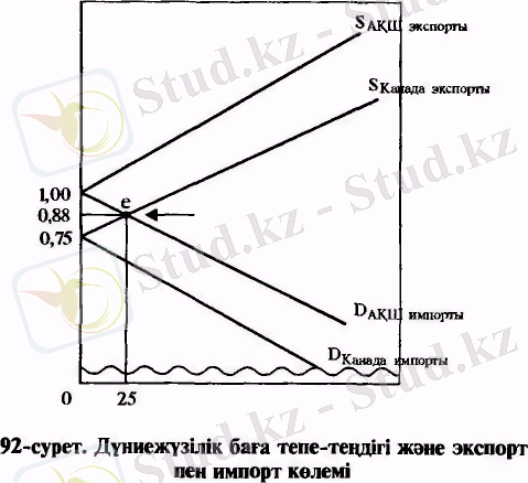 Дүниежүзілік баға тепе-теңдігі, экспорт және импорт. АҚШ пен Канаданы мысал ретінде қарастырып, енді алюминийдің дүниежүзілік бағасын және дүниежүзілік экспорт пен импорт көлемін анықтай аламыз. 92-суретте америкалық экспорт ұсынысы және импорт сұранысы (906 сурет) және Канаданың экспорт ұсыныс мен импорт сұранысы (916 сурет) біріктірілген. АҚШ-қа байланысты (бағытталған) ә қисығы американың алюминий бағасынан оңға қарай бағытталған. Канаданікі де сол сияқты. 2 мемлекетті қарастырғанда халықаралық тепе-тендік - бір мемлекеттің импорт сұранысы мен екінші мемлекет экспорт ұсынысы қисықтарының қиылысу нүктесі. Бұл жағдайда АҚШ импорт сұраныс қисағы Канаданың экспорт ұсыныс қисығымен е нүктесінде қиылысады. Алюминийдің дүниежүзілік бағасы 0, 88 долл. Канаданың экспорт ұсынысының қисығы дүниежүзілік баға 0, 88 долл. болғанда Канада 25 млн. фунт алюмининді экспорттайтынын көрсетеді. Ал АҚШ 25 млн. Канаданың алюминийін импорттайды. Дүниежүзілік баға импорт сұранысы мен экспорт ұсынысының көлемін теңестірді (25 млн. фунт) және бұл баға дүниежүзілік ұсыныс пен импортты көрсетеді. Дүниежүзілік бағаға айырбас жасаған кезде осы баға екі елде де орнатылады. Бәсекелестік нарықта белгілі бір стандартты тауарға тек бір ғана баға болады. Халықаралық саудада барлық тұтынушылар алюминийді 0, 88 долл. сатып ала алады. Дүниежүзілік бағаға теңестірілген кезде канадалықтар айырбасқа дейінгі бағаға қарағанда алюминийді қымбаттырақ алады (0, 88 долл. және 0, 75 долл. ), ал АҚШ керісінше арзан бағамен алады (0, 88 долл. және 1 долл. ) - Неге Канада 50 млн. фунт алюминийді АҚШ-қа импорттайды? Өйткені олар алюминийден түскен ақшаға басқа тауарларды сатып алады. Мысалы, АҚШ-тың компьютерлік бағдарламасы.