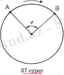 1. Бұрыштық ығысу. Материялық нүкте шеңбер бойымен бірқалыпты қозғалсын және бұл нүкте t 1 мезетіндегі А қалпынан t 2 мезе-тіндегі В қалпына орын ауыстырсын (3-сурет) . Шеңбердің центрінен материялық нүктеге жүргізілген радиус осы уақыт ішінде бұрышын сызады, оны бұрыштың ығысу деп атайды.