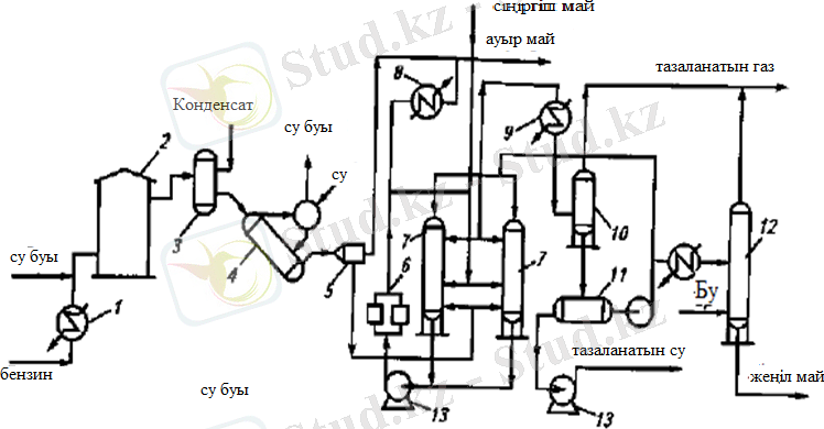 1-Жылуалмастырғыш; 2 -пеш; 3- аппарат; 4 - қазан-утилизатор; 5 - маймен шаюға арналған ыдыс; 6- фильтр; 7- колонна; 8- тоңазытқыш; 9- конденсатор- тоңазытқыш; 10- сеператор; 11- сеператор-тұндырғыш; 12- буландырғыш колонна; 13- насос.