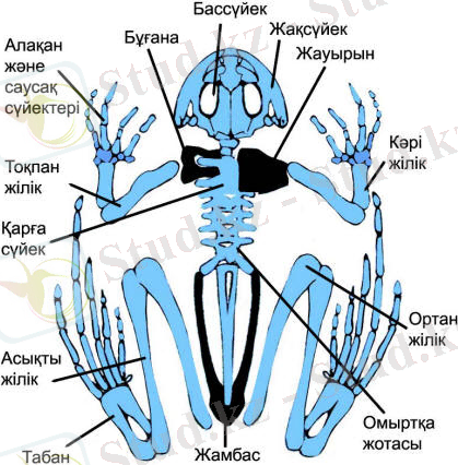 Қаңқасы балықтармен салыстырғанда күрделі, 4 бөлімге бөлінеді. Олар: бас-сүйек, омыртқа жотасы, иық белдеуі мен алдыңғы аяқтарының және жамбас белдеуі мен артқы аяқтарының қаңкасынан құралады. Омыртқа жотасы мойын, тұлға, сегізкөз және құйрық бөлімдеріне бөлінген. Мойын мен сегізкөз бөлімдерінде бір ғана омыртқадан болады.